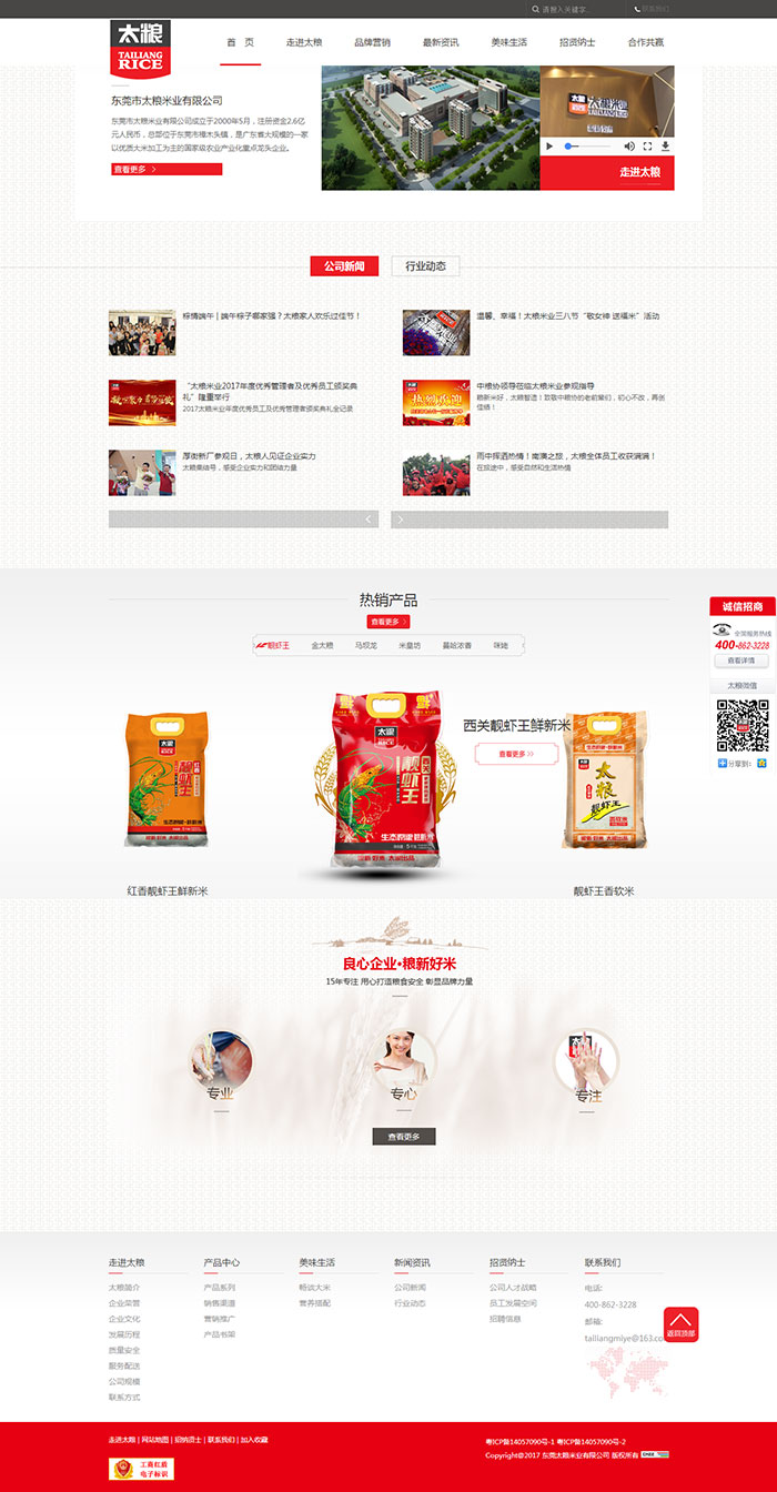 东莞市太粮米业有限公司成立于2000年5月,注册资金人民币2.6亿元,员工近1000人,总部位于东莞市樟木头镇,是广东省内一家以优质大米加工为主的农业产业化国家重点龙头企业。公司集稻米种植、收购、储运、生产、销售于一体,打造完整产业链经营模式。经过“太粮人”近二十年的努力奋斗,公司得到了迅速发展。除总公司及在建新总部外,下设东莞厚街分公司、佛山分公司、广州分公司、广西子公司、江苏子公司及湛江、海口、厦门三大营销中心,现已成长为广东省内颇具规模与知名度的大米经营企业之一。