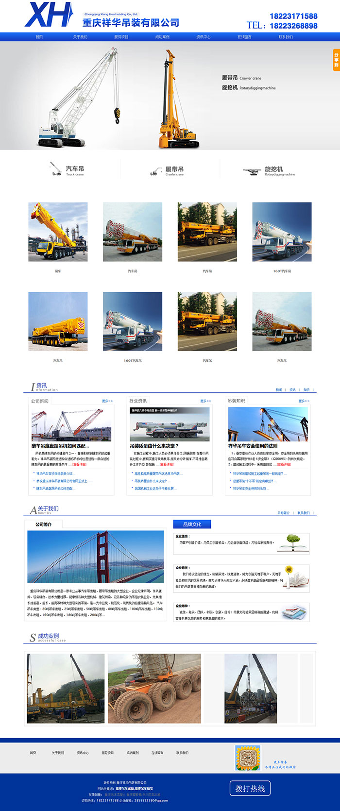 重庆祥华吊装有限公司是一家专业从事汽车吊出租、履带吊出租的大型企业。企业纪律严明,作风硬朗,设备精良,技术力量雄厚,能承载各种大型机械,建筑桥梁,及各种设备的吊运安装业务,尤其擅长对超高、超长、超宽等特种大型设备的吊装,是一支专业化、规范化、现代化的起重运输队伍。公司从实际出发,发展优势,突出重点,发展自己的特色产业,主要服务于各地大型工程项目,特别是在冶金化工、电力、市政施工、矿山、道路桥梁等领域享有较高声誉,形成了以重庆市为中心,向全国辐射的良好发展趋势。